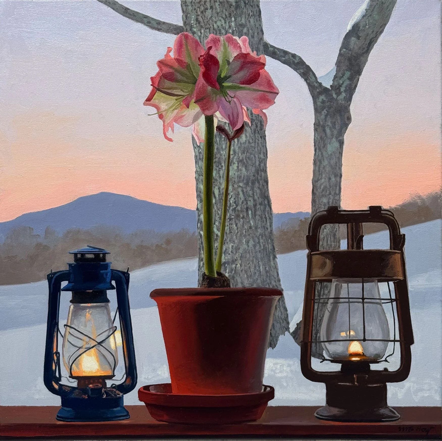 Winter skies can rival the petals of an amaryllis. Or—in this case—drop a complimentary stage curtain behind the windowsill worthy of a curtain call.
